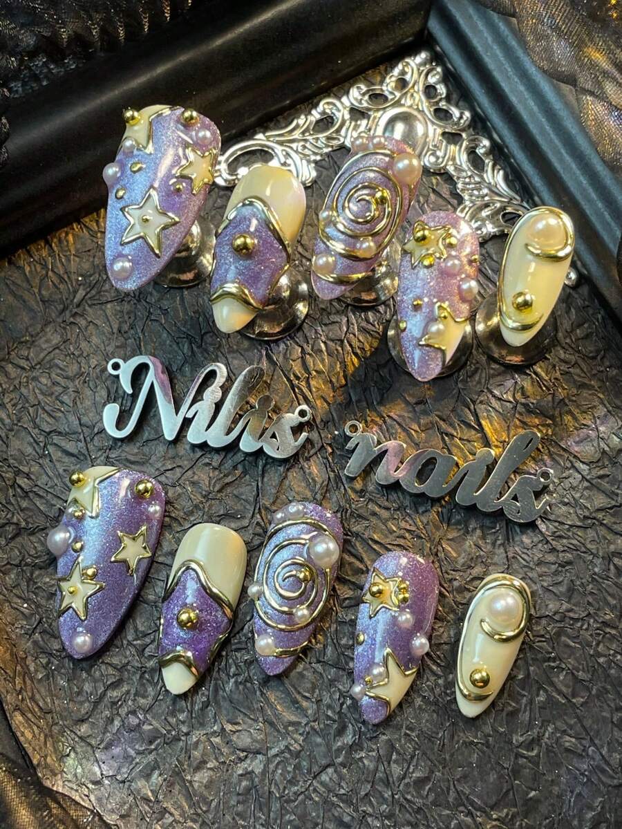 10pcs Almond Shaped Set Nails,Light Purple Cat Eyes&Apricot Tie Dye Style Nails,3D Three-Dimensional Steel Beads&Pearls Nails Accessories Decorations,Hand Painted Metal Geometric Pattern& Star Nails Design,Patterns In Y2K Style Nails Wearable Nail Art Set,Suitable For Women To Wear Daily Parties (Includes:A Piece Of Jelly Glue And A Friction Strip)Nail Supplies Nails