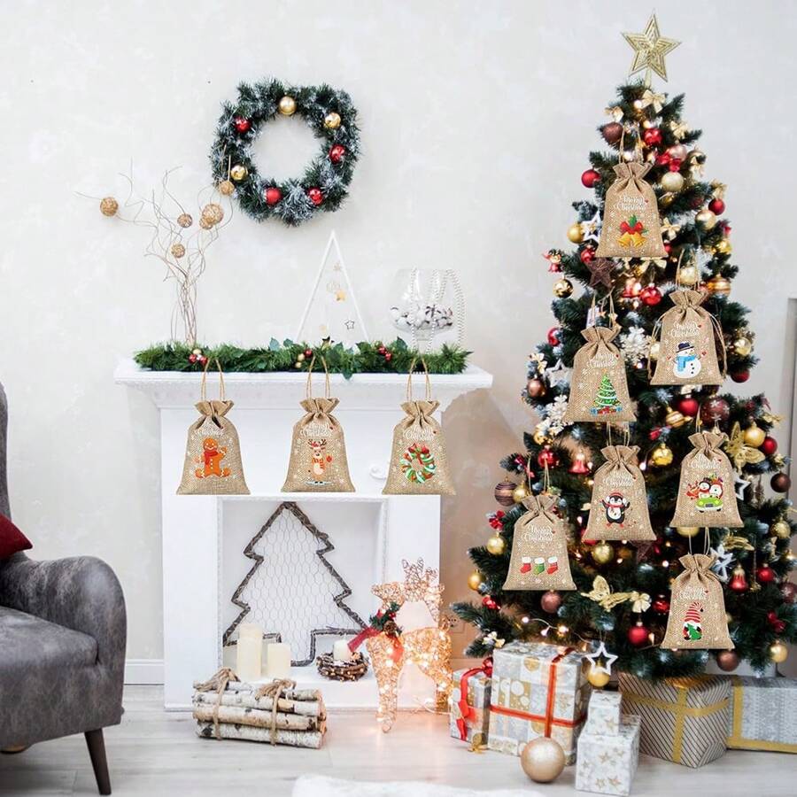 12 Pieces Christmas Burlap Gift Bags Snack Container Christmas Treat Bags With Double Jute Drawstrings Small Goody Bags For Xmas Holiday Party Favors Supplies, Snowman, Santa Claus, Penguin, D,Christmas Valentine Day