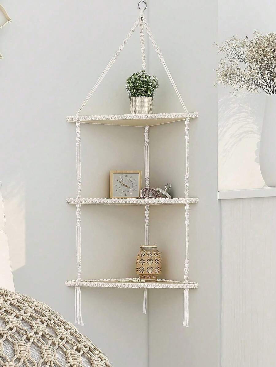 1pc Bohemian Style Handwoven White Rope & Beige Hanging Corner Shelf, Decorative Storage Rack For Bedroom, Bathroom, Office, Living Room - Suitable As Christmas, Halloween, And Holiday Gift