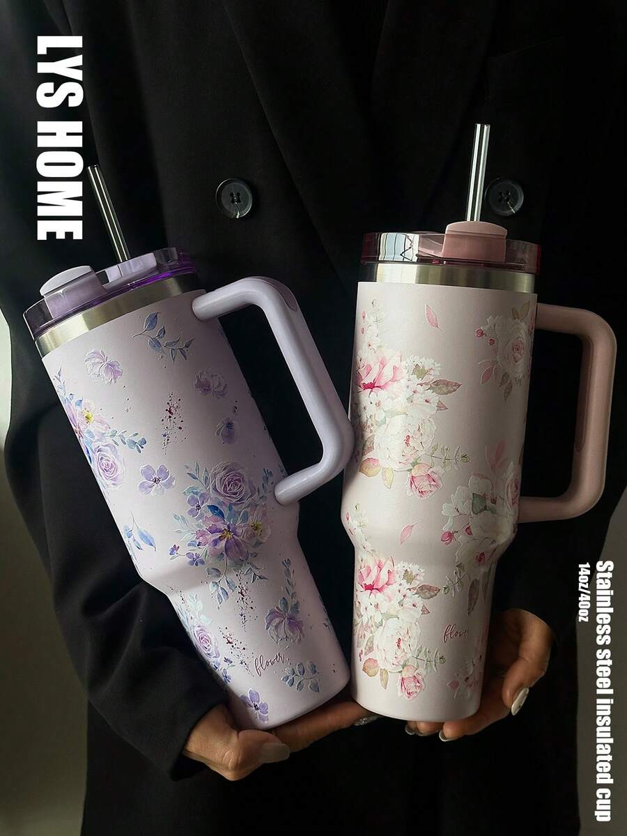1pc Watercolor Floral Design 40oz-14oz Large Capacity Travel Mug With Handle, Stainless Steel Insulated Cup, Suitable For Car, Travel, School, Office, Outdoor, Gym, Home, Perfect Gift For Women, Teens, Holidays, Birthdays (With Straw)