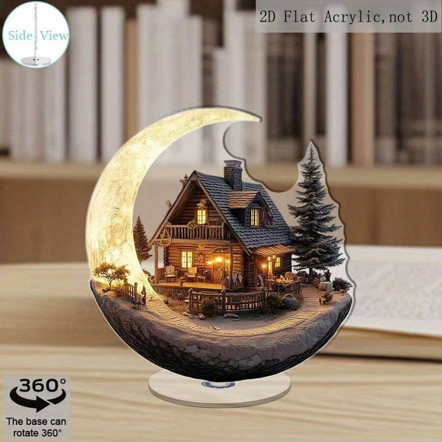 2D Acrylic Rotating Desktop Decoration, Western Cowboy Scene With Moon, Wooden House And Pine Trees