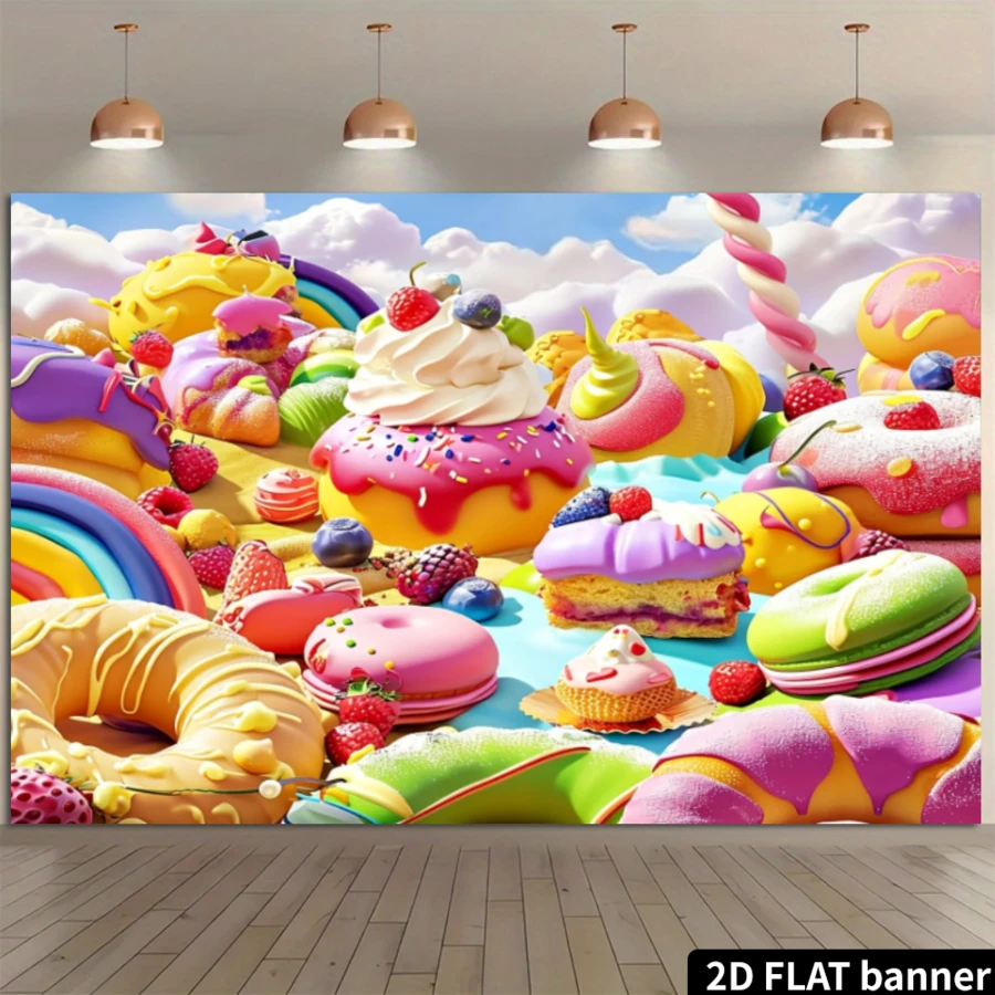 2D Flat 1pc Dreamy Candy Land Landscape Background With Ice Cream, Sweets, Lollipops, Rainbow, Birthday Party Decor, Photography Studio Backdrop Banner
