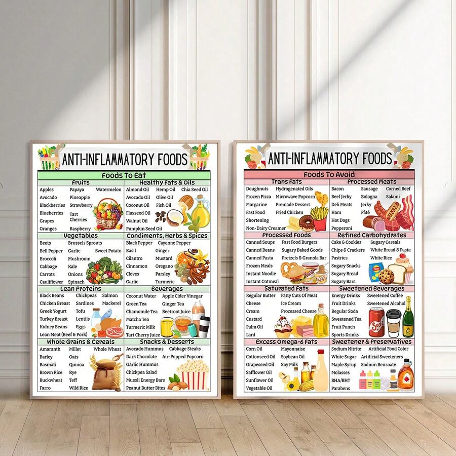 2PCS Anti-Inflammatory Diet Poster Set - Food Guidelines For Reducing Inflammation, Nutrition Reference Tables, Healthy Diet Wall Decorations, Kitchen Decorations, And Healthy Gifts For Family And Friends,Canvas Art Wall, Room Poster, Home Decoration,Room Decoration Supplies, Bedroom, Living Room Decoration, Optional Frame