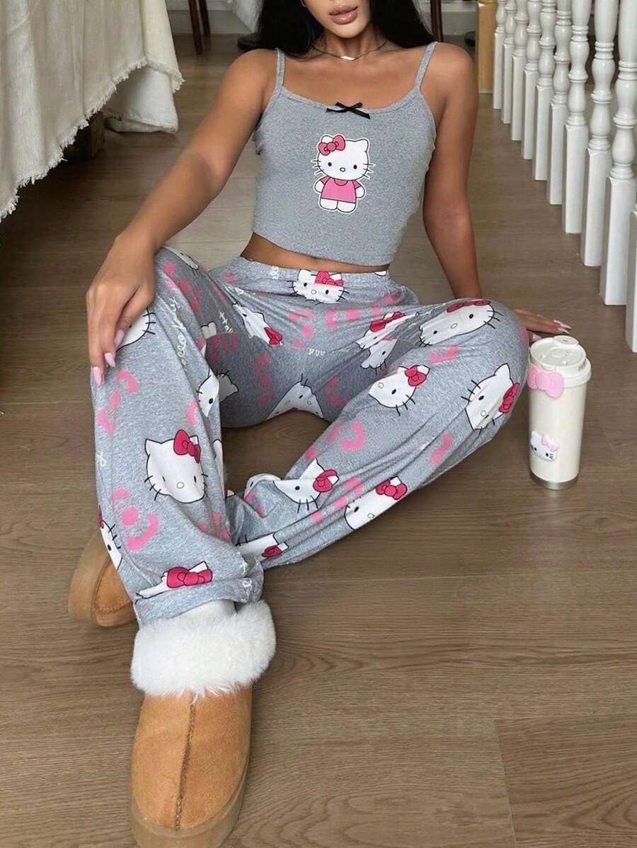 Sanrio 2pcs Hello Kitty Print Women's Camisole Crop Top + Elastic Waist Straight Pants Cute Pajama Set