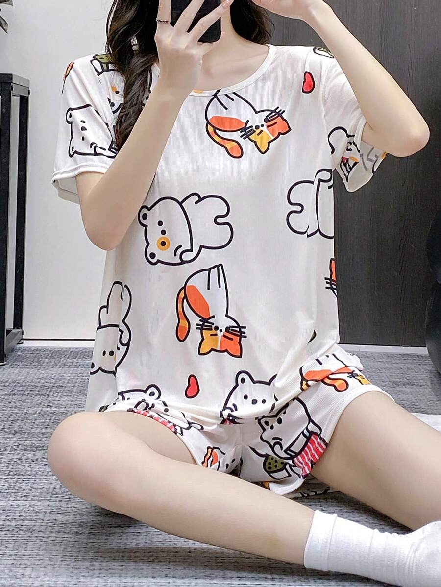 2pcs Spring, Summer & Autumn Pajama Set, Minimalist And Cute Sleepwear Lounge Wear, Effortless Draping Short Sleeve Suit, Wearable As Outerwear, Two Pieces Set