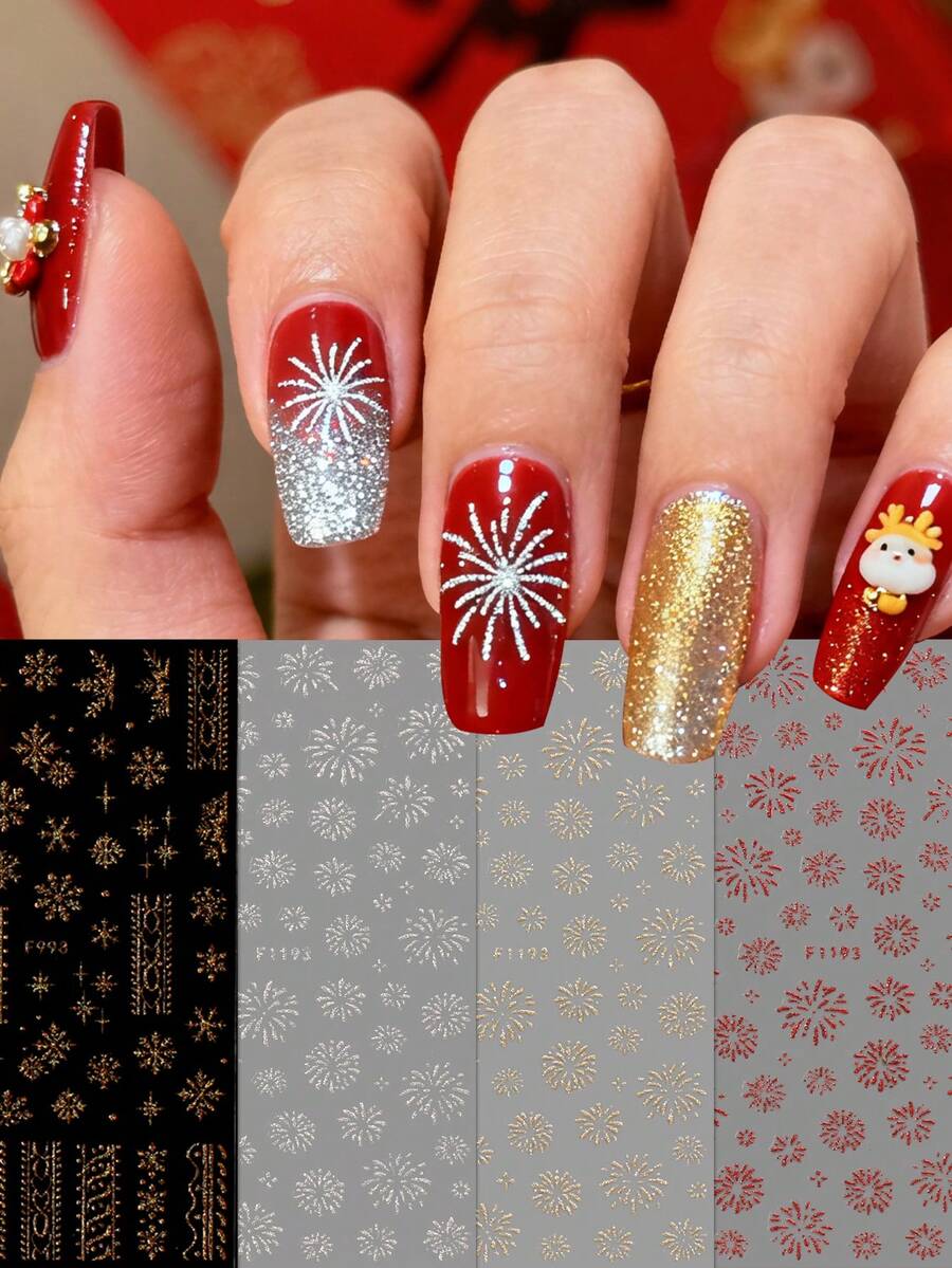 4 Pieces Of New Year Fireworks Glitter Nail Art Stickers - DIY Art Design Of Dazzling Fireworks And Snowflakes For Valentine's Day And New Year's Day, Suitable For Women's Daily Life, Weddings, And Holidays. Disposable Self-Adhesive Back Adhesive Nail Art Stickers With A Simple And Luxurious Theme Style, Easy To Stick Nail Decoration Stickers