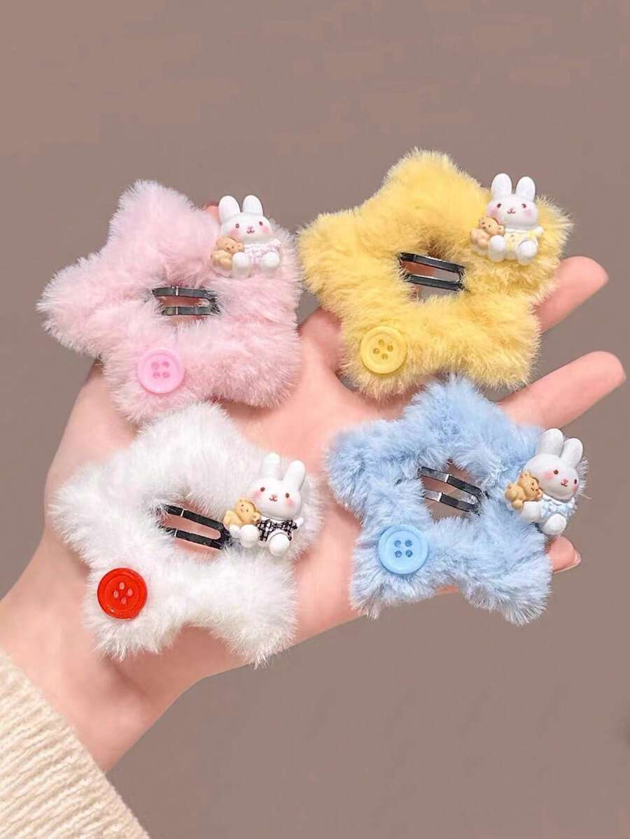 4pcs Cute Colorful Plush Star Hair Clips For Women, Sweet Personalized Side Bangs Decor BB Clips With Adorable Button & Rabbit Decor, Elegant Y2K Style Hair Accessories For Daily, Date, Party, Claw Clips, Hair Slide, Hair Barrettes