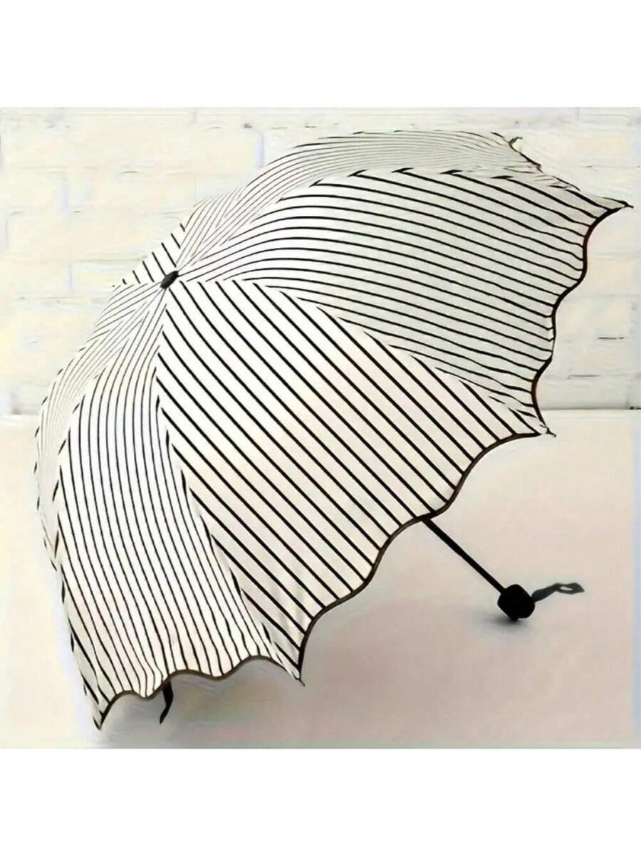 Fashionable Waterproof Striped Umbrella, Manual Folding Umbrella, Distinctive Waterproof Striped Umbrella With Lace Details - Durable Iron Frame, Easy To Clean In Rainy Days, Easy To Clean Sun Umbrella