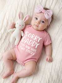 Baby Girl Newborn Cute Pink "SORRY DADDY YOU NOW HAVE TWO BOSSES" Graphic Print Short Sleeve Bodysuit, Adorable Newborn Clothing, Infant Outfit, Spring/Summer, Comfortable Casual Wear, Infant/Toddler Girl Summer Apparel, Outdoor, Photography, Indoor, Holiday, Gift