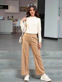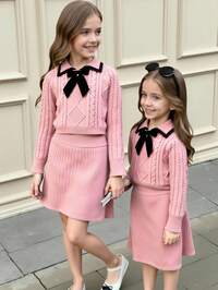 SparklynSHEIN Sparklyn 2pcs Teen Girls Sweater Set, Minimalist Apricot V-Neck Cable Knit Texture, Embroidered Horse Pattern, Fitted Cuffs, Paired With Matching Pleated Mini Skirt, Casual Sporty Style, Soft & Smooth Fabric, Suitable For Daily Wear, School, Outdoor, Party In Spring & Autumn Girls Sweater Sets Long Sleeve Top Set For Teen Teen Skirt Set White Girl Clothes Girl Knit Set Embroidered Sweater Long Sleeve Dresses White Sweater Teens Jumpers Dress Dress Girl Teem Color White Cable Knit Dress White Knitted Dress Dress Girl White