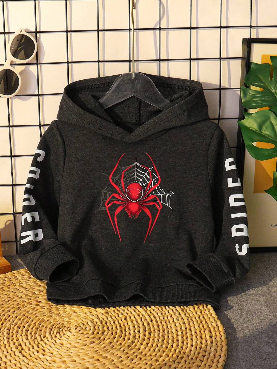 Toddler Boys' Cool Street Fashion Casual Outdoor Gift Cute Comfortable Spider Web & Letter Print Solid Color Hooded Long Sleeve Sweatshirt, Autumn