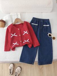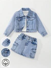 SHEIN Young Girls 2-Piece Denim Set, Sweet And Playful Casual Fashion Recommendation! Classic Washed Blue Denim, Comfortable Fabric, Casual Fitted Cute Bow Embroidered Vest Top & Casual Fitted Fashion Bow Embroidered Denim Pants, Suitable For Daily Wear, Simple And Fashionable Versatile, Whether For Daily Outings, Campus Casual, Weekend Trips, Back To School Season, Vacation, Etc., Let The Child's Every Day Be Full Of Fashion And Vitality! SHEIN Explorewe Young Girls' 2-Piece Set, Washed Light Blue Jacket Coat With Collar, Button Front, Paired With Denim Cargo Skirt, Multi-Pocket Design, Slim Fit, Suitable For Outings, Dates, Casual Activities, Parties, Daily School Style, Making The Little One The Shining Star Among The Crowd Fall Winter #8 Bestseller