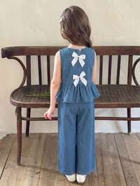 LMoss KidsLMoss Kids 2pcs/Set Young Girl' Spring Summer Boho Casual White Bowknot Blue Denim Ruffle Trim Vest And Elastic Waist Baggy Jeans Spring Summer,For Girls Spring/Summer Dailywear Outfits,Girls Streetwear Outfits,Girls Beach Outfit,Vacation Outfits For Girls ,Casual Two-Piece Sets For Girls ,Graphic Jeans,Toddler Two-Piece Sets,4-Year-Old Girls Two-Piece Sets ,Summer Two-Piece Sets,Bowknot Two-Piece Sets