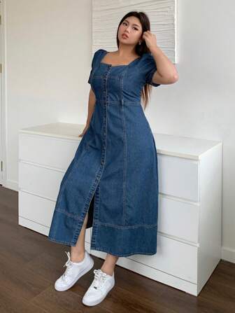 DAZY Dark Washed Blue Square Collar Puff Sleeve Fitted Maxi Denim Dress, Spring/Summer