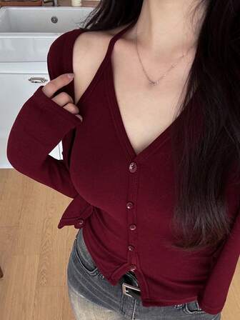 DAZY 2pcs/Set Sexy Design Long Sleeve T-Shirt, Halter Neck, Slim Fit, Casual Top For Women