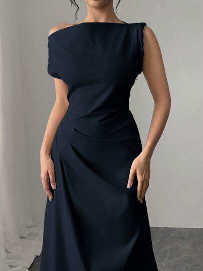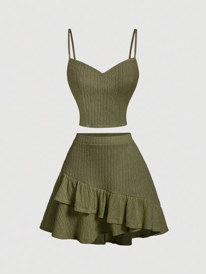 Elegant Asymmetric Solid Color Blouse & Low Waist Pleated Mini Skirt Set, Sexy Casual Party Net Splice Ruffle Hem Asymmetric/Asymmetrical Two Pieces Outfit For Evening Date, Beach, Wedding, Home